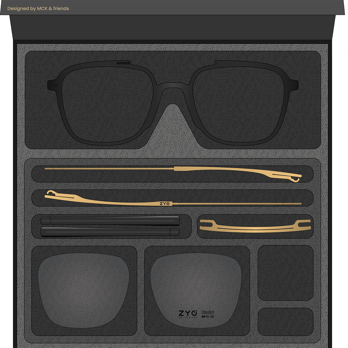 Frames ship to the optician as a precise kit—3D-printed front, laser-cut beta-titanium temples with FlatMatic plug-in fixation, two temple-tip sleeves, and an optional double bridge (depending on the frame selected). Each pair is easy to customise in store: opticians assemble, set length/curve/tilt/balance, and can order components separately for a fully individualised frame. The sleeves come in two sizes to set temple length precisely during fitting. Design & Produce by ZYÖ and assemble by your optician.